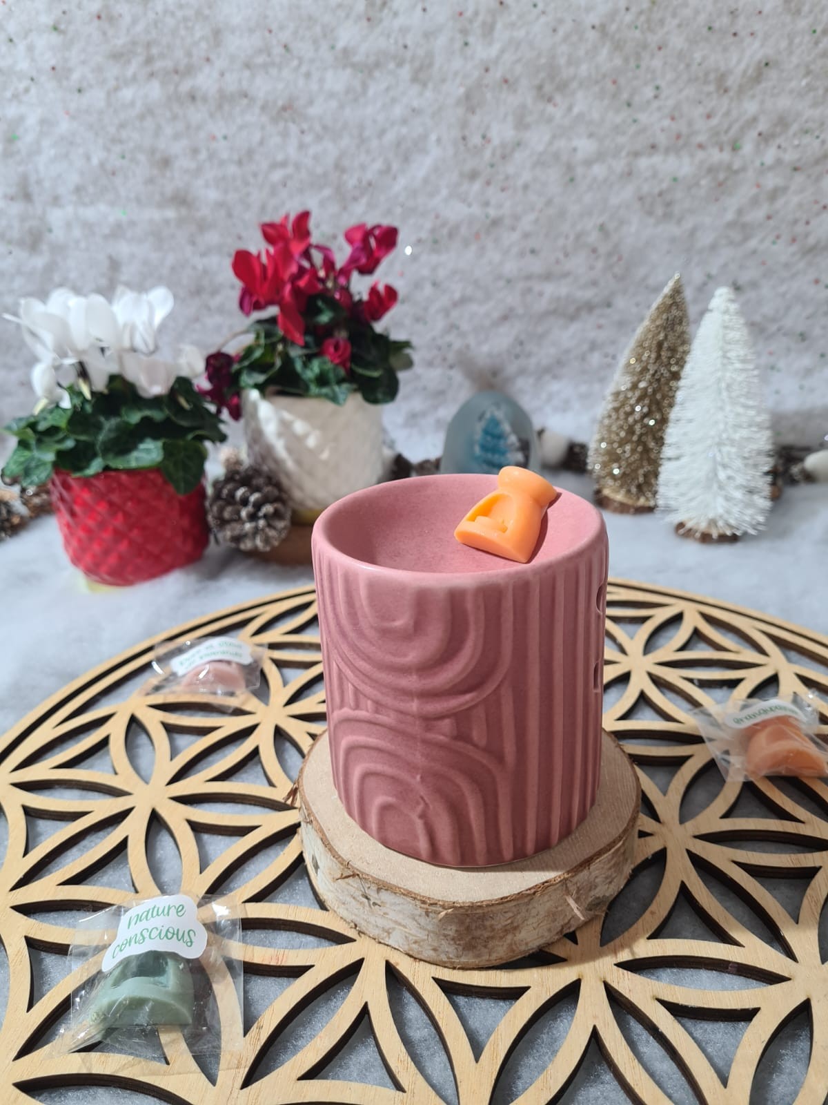 Brûleur en céramique blanc et rose au design épuré, idéal pour fondants parfumés. Sa coupelle supérieure accueille le fondant, tandis que la base permet d’y glisser une bougie chauffe-plat.