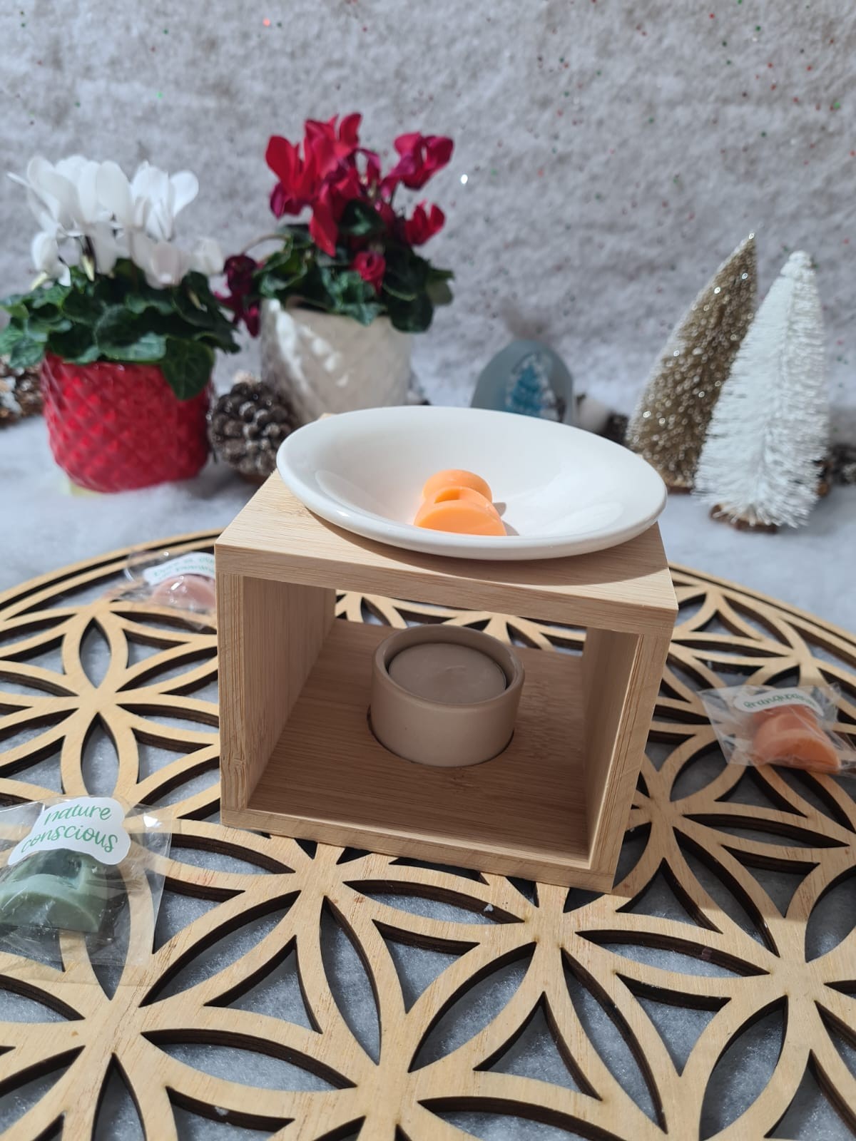 Brûleur en céramique blanche au design épuré, accompagné d’un support en bois ajouré qui apporte une touche naturelle et chaleureuse. La coupelle supérieure accueille le fondant parfumé, tandis que l’ouverture frontale permet de glisser une bougie chauffe-plat. L’ensemble crée un objet décoratif élégant, mêlant douceur de la céramique et authenticité du bois.