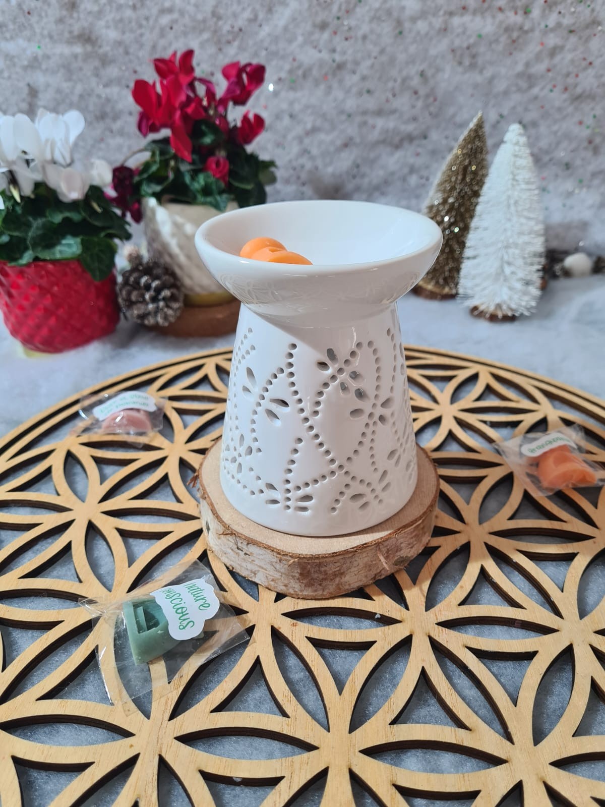 Brûle‑parfum en céramique blanche, doté de découpes ajourées qui laissent passer la lumière de la bougie et projettent de délicats motifs lumineux dans la pièce.