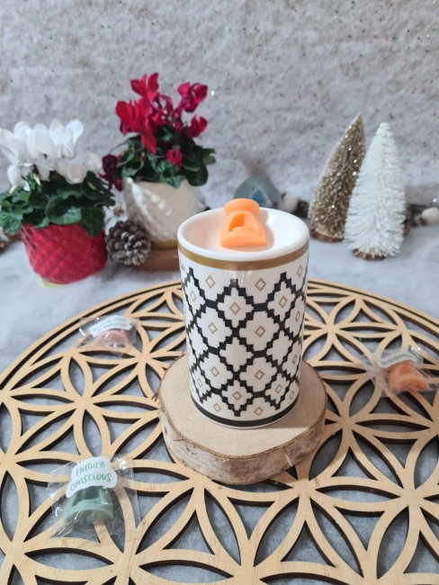 Brûleur en céramique au design dessin, idéal pour fondants parfumés. Sa coupelle supérieure accueille le fondant, tandis que la base permet d’y glisser une bougie chauffe-plat.