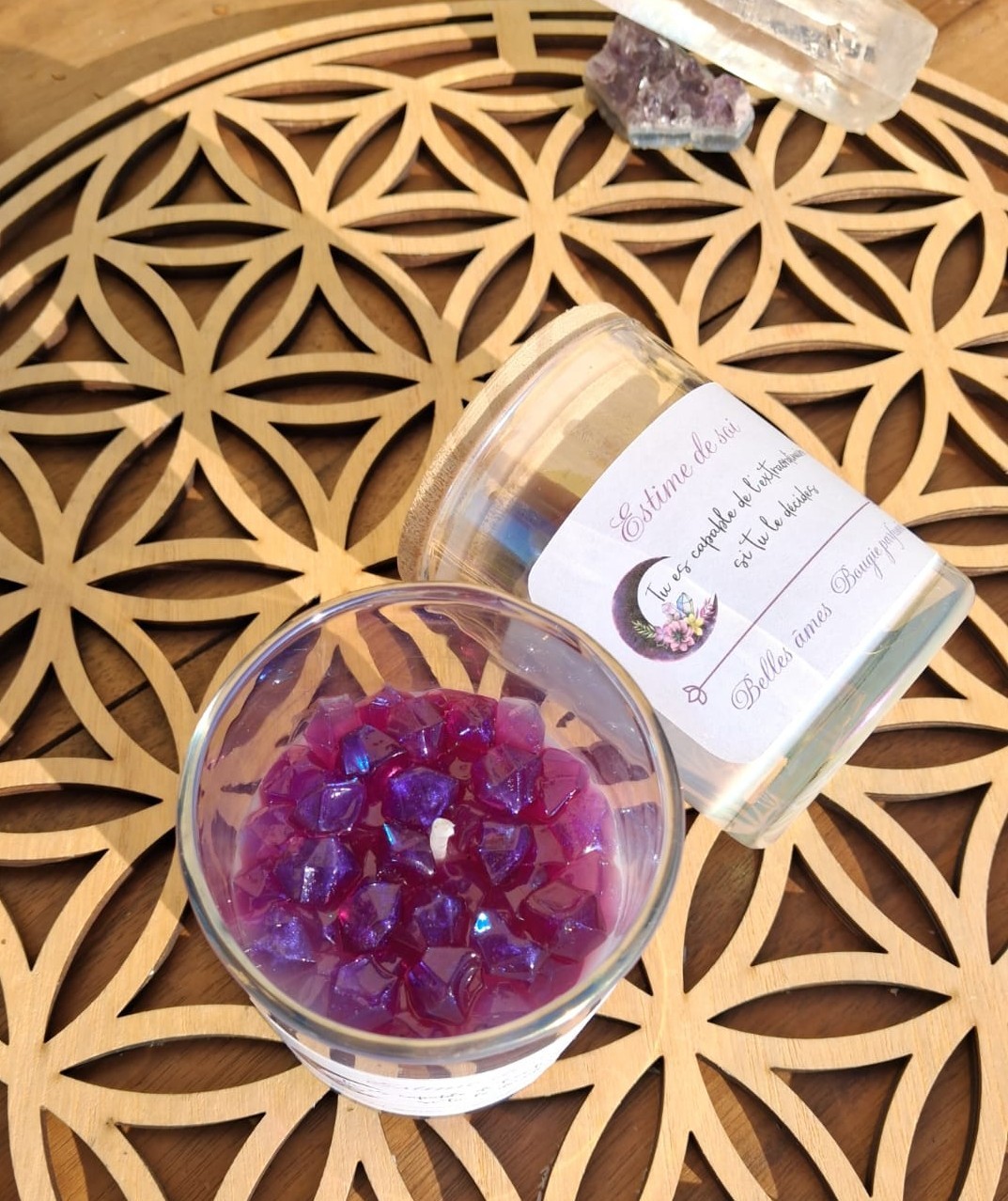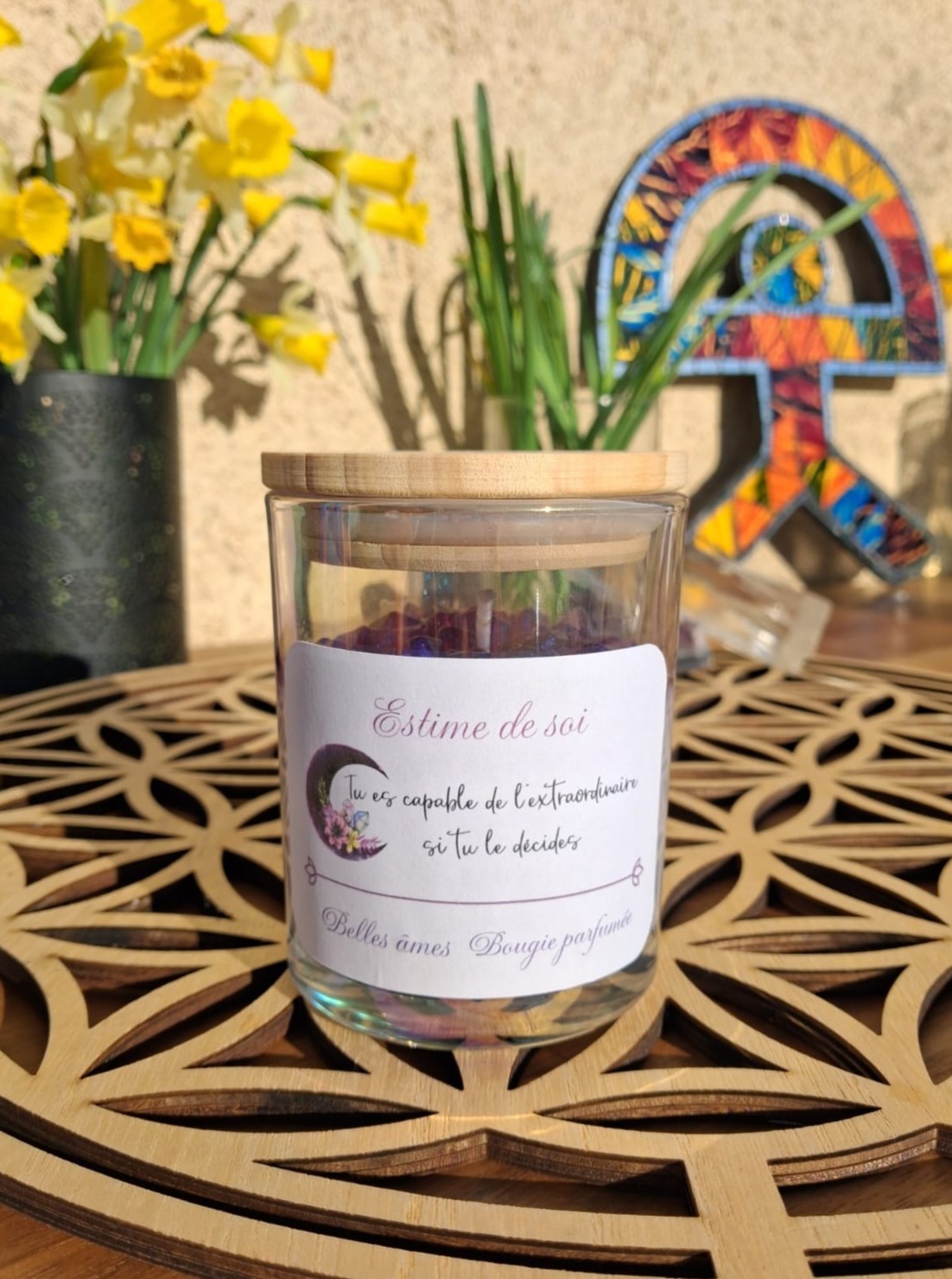 La bougie Estime de soi a été imaginée comme un support doux, un moment pour se recentrer et se rappeler sa propre valeur. Coulée à la main en cire coco & gel, elle révèle un magnifique effet “cristaux” naturel, obtenu uniquement grâce à la texture de la cire — sans pierres ajoutées.