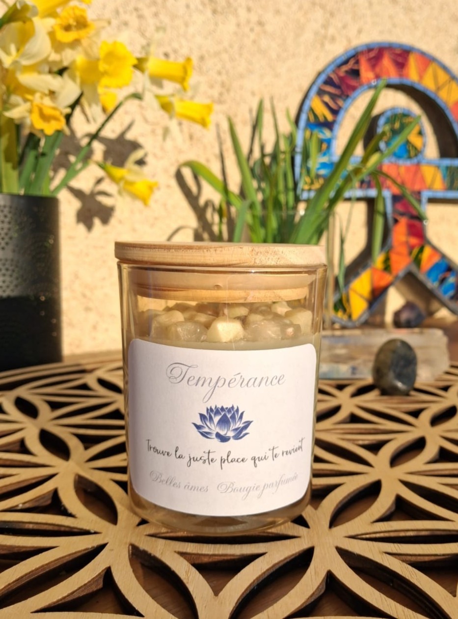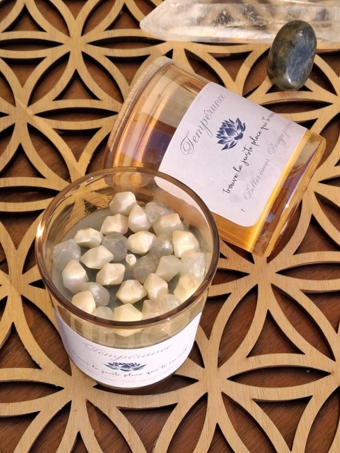 La bougie Tempérance est une invitation à retrouver l’équilibre intérieur, à respirer plus lentement, à revenir à soi. Coulée à la main en cire coco & gel, elle dévoile un effet cristallin naturel obtenu uniquement grâce à la cire — sans pierres ajoutées — pour une esthétique douce et apaisante.